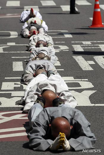 大韓仏教曹渓宗社会労働委員会の僧侶が8日、尹錫悦(ユン・ソンニョル)大統領と岸田文雄首相による日本政府の放射能汚染水放流中止の約束を求めて、ソウルの曹渓寺から日本大使館前まで五体投地行進を行っている。