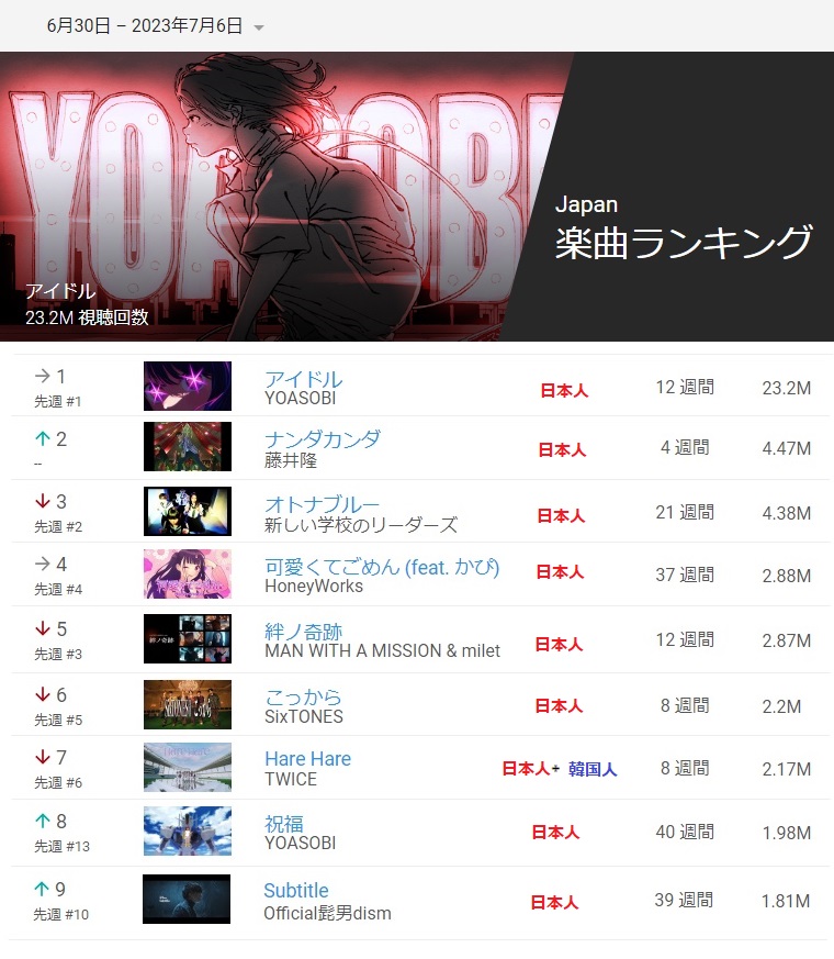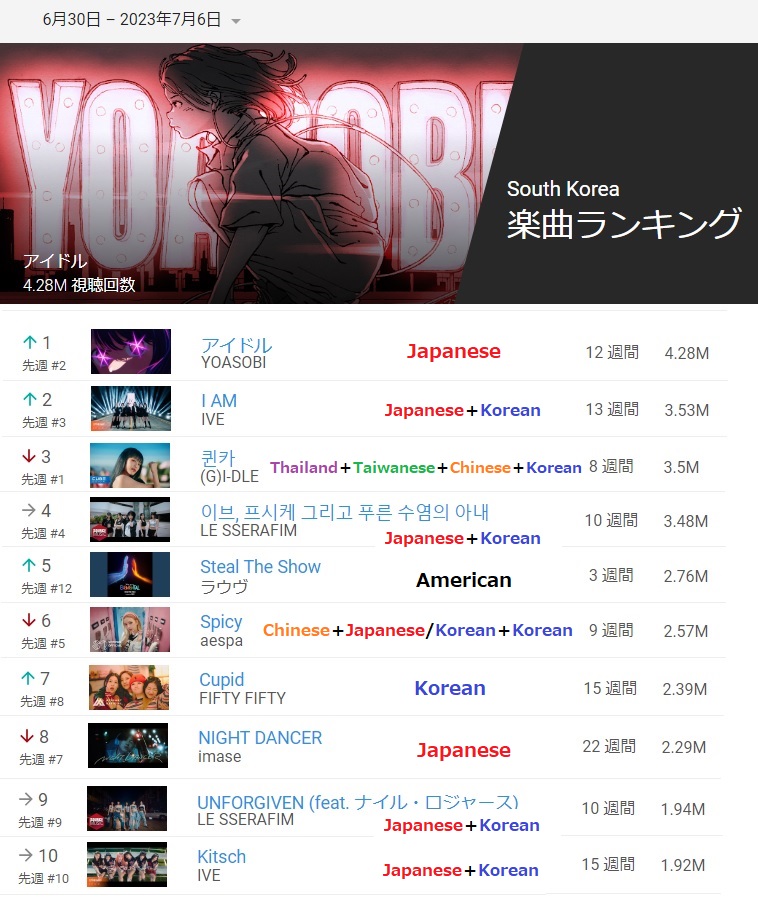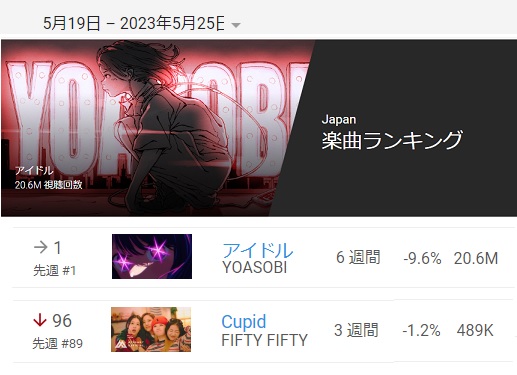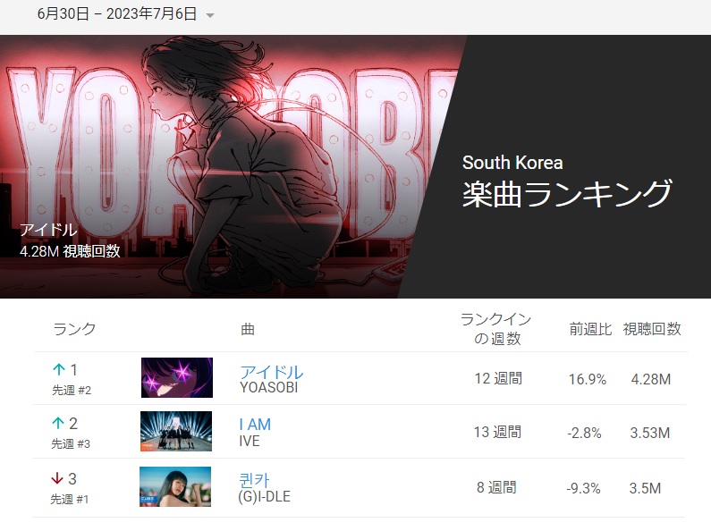 韓国の youtube 楽曲ランキング より、YOASOBI 「アイドル」の再生数