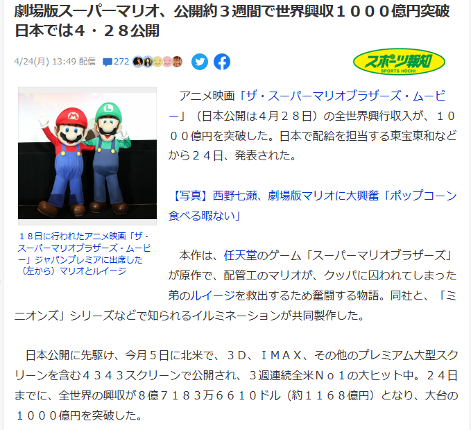 https://twitter.com/DiscussingFilm/status/1652687064394080256映画「スーパーマリオ」世界興行収入10億ドル突破、アニメ映画史上10位に浮上