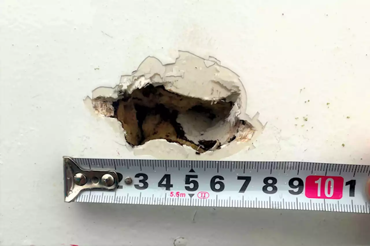 コンテナは木製とみられ、めり込んだ部分には縦3センチ・横6センチほどの穴があいていました。
