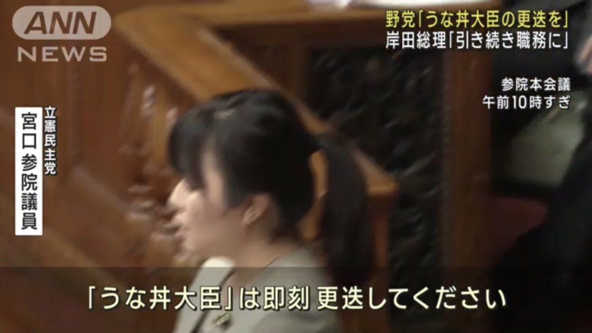 首相と同じ広島選出の立憲民主党の宮口治子議員が「広島サミットを前に危機感も緊張感も感じられない。『うな丼大臣』は即刻更迭してください」と求めたが、岸田首相は「引き続き職務に当たってもらいたいと思っている」と述べるにとどめた。