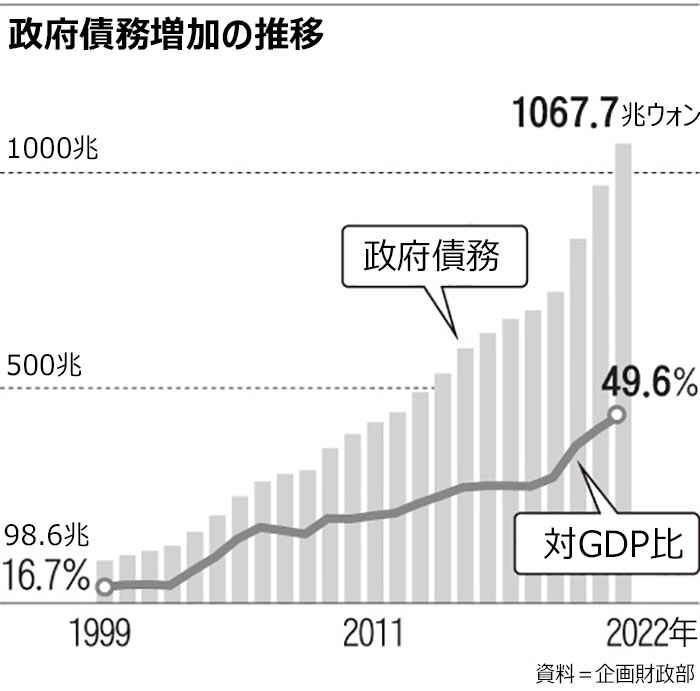 大規模拡張財政基調を見せた文在寅(ムン・ジェイン)政権当時と比較すると増加ペースは確実に鈍化している。国家債務は文政権が発足した2017年には660兆2000億ウォンだったが、退任時期の2022年には1067兆7000億ウォンと5年間で62%も増えた。こうした流れに尹錫悦(ユン・ソクヨル)政権がブレーキをかけたが、増加は防げなかった。