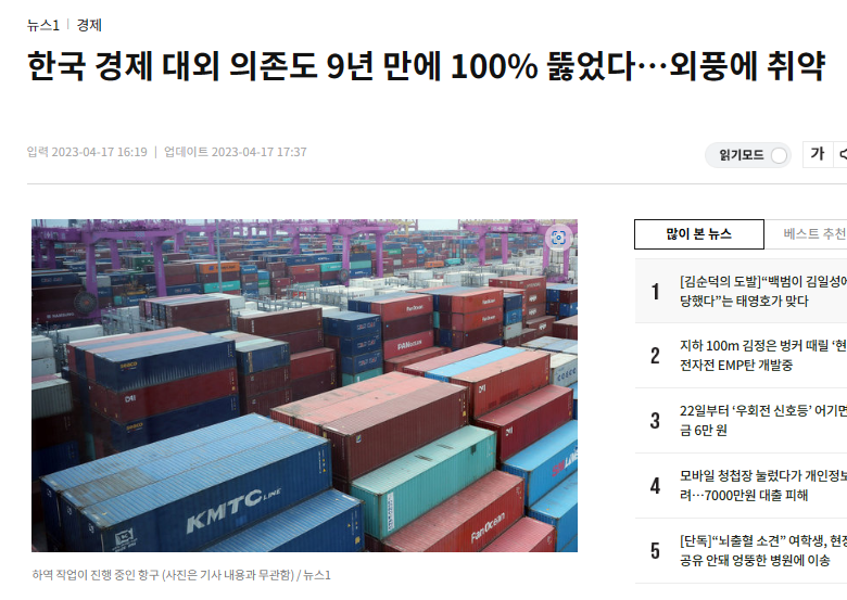 韓国の対外依存度を示す指標が9年ぶりに100%台を超えた。過去4番目に高い数値を記録し、外的要因に脆弱な韓国経済の状況を示した。