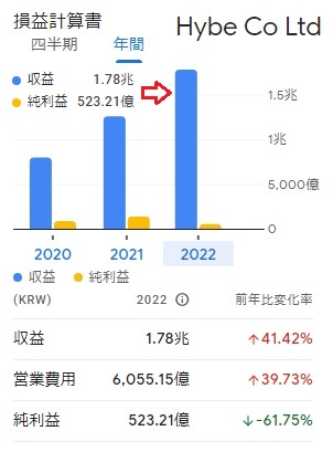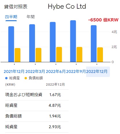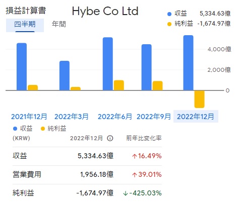HYBE は、やたらに買収やら株式取得やらを繰り返して、実際の収支が判りにくくなってる。決算を見ると、第4四半期が赤字に転じているから、資産が増えているのか、と思ったら、資産も大幅に減らしている。しかし営業利益だけは大幅増と報告されてる。