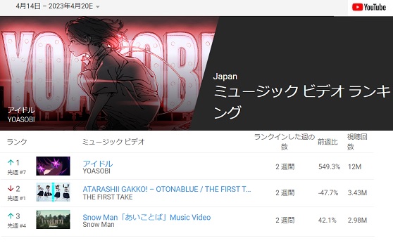今、YOASOBI の「アイドル」が猛烈な勢いで人気になってるんだけど、Youtube Music charts のランキングから、消されているんだよ。