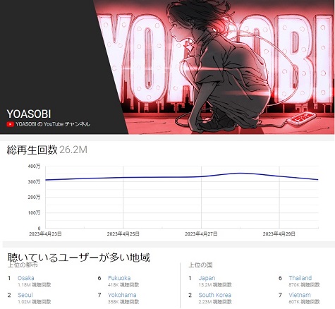 実際に、YOASOBI の直近の動画再生を見れば、日本が全体の半数を占めていて、当該MV週間2000万回超の再生に対して日本だけで1000万回の再生がある、というのは理に適っている。
