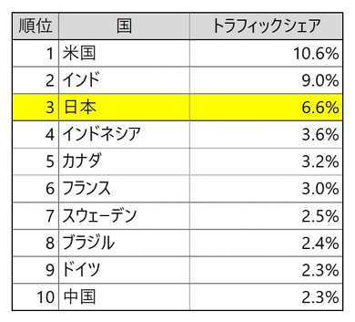 ChatGPTのWeb版や、画像生成サービス「DALL-E」のドメインである「Openai.com」への国別トラフィックシェア(2022年11月~2023年4月)は、上位から米国が10.6%、インドが9.0%、日本が6.6%、インドネシアが3.6%、カナダが3.2%。