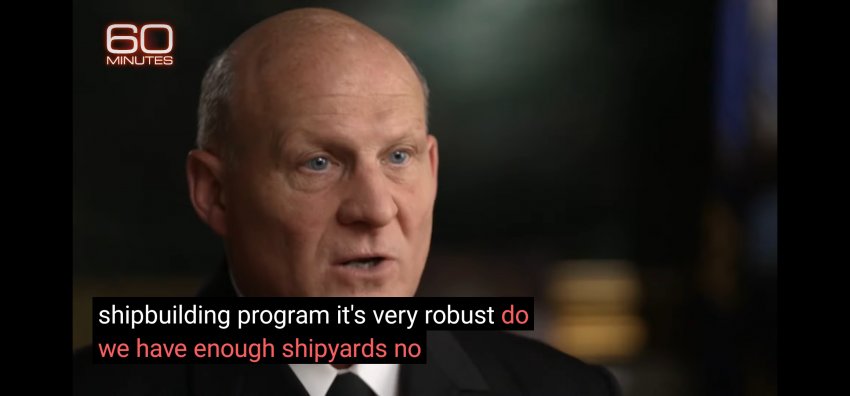 したがって、今後米国はTSMCだけでなく、台湾島で価値のあるすべてのことをできるだけ引き出そうとしていると思う。 米国が中国の台湾侵攻を阻止しようが失敗しようが、台湾は完全に廃墟となる確率が非常に高いからだ。 また、中国が単に民族的な自尊心のためだけでなく、先に述べた戦略的な理由でも最優先目標にせざるを得ない台湾にサプライチェーンを依存するということは、米国の立場からしてあまりにもリスクが大きいことだ。 米国が台湾に感じる安保不安感は、韓国人が想像すらできないほど非常に大きいという事実を知らなければならない。 台湾に比べると、韓半島の安保リスクは米国に限られる。再びドキュメンタリーに戻れば、米議会で冷戦後、史上最大規模の米海軍増強計画(Battleforce 2045:2045年までに500隻規模の海軍艦隊を建設するという計画)を通過させたと述べている。 必ず中国海軍を南シナ海に閉じ込めておいて、出られないように止めて殺さなければならず、そのためには圧倒的な海軍力が欠かせないからだ。 この計画で注目すべきは、完全につぶれていた米国造船業に数百億ドルの巨額を投資し、造船業インフラを復活させようとしていることだ。 強力な海軍建設のためには、米国造船業の復活が欠かせないからだ。 添付3が米海軍参謀総長マイケル·ギルデイ提督とのインタビューだが、「(中国海軍を相手に)私たちに十分な造船所があるか」というアンカーの質問(Do we have enough shipy.ards?)に「No」と答え、さらに多くの造船所を建設しなければならないと答える場面だ。