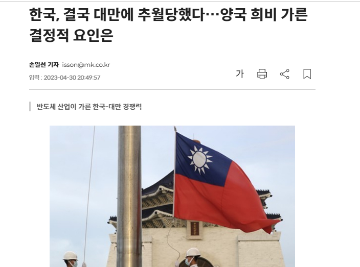 ある北京消息筋は「台湾国家代表半導体企業であるTSMCの時価総額が2019年サムスン電子時価総額を逆転したのが今後各種経済指標で台湾が韓国を追い越すということを予告したのと同じだった」と話した。