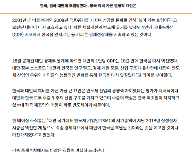 28日公開された台湾経済部の統計によると、台湾の1人当たりGDPは18年ぶりに韓国を再び逆転させた。 台湾政府自らも「台湾と韓国は人口密度、経済開発モデル、産業構造が似ているが、台湾が半導体産業の優位と企業の能動的な変化を通じて韓国を再び追い抜いた」と意味を付与した。