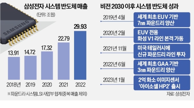 サムスン電子のシステム半導体(メモリー半導体を除く製品·サービス)売上が年30兆ウォンまで急増した。 システム半導体事業の主要軸であるファウンドリー(半導体受託生産)は、100兆ウォン以上の受注残高を確保した。
