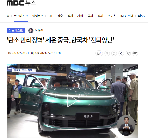 2023年5月1日、韓国・MBC NEWSは「今年1~3月期に過去最高の業績を上げた韓国の自動車メーカーだが、唯一中国市場では苦戦しており、かつて10%を超えていた市場シェアは昨年に1%まで低下した」とし、「中国は電気自動車(EV)産業育成のため新エネ車の義務割合を強化し続けており、韓国メーカーの厳しさはさらに増している」と伝えた。