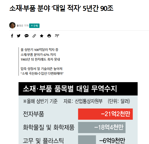정부가 매년 수조원의 예산을 투입해 소부장 산업의 경쟁력 강화를 추진했지만 정부가 수입 다변화와 경쟁력 강화 모두를 놓쳤다는 비판이 나온다. 정부는 그동안 소부장 100대 품목의 일본 의존도가 2019년 30.9%에서 2021년 24.9%로 6%포인트 줄었다고 대대적으로 홍보해왔다. 하지만 같은 기간 100대 품목의 중화권 의존도는 23.5%에서 25.1%로 증가했다. 일본 의존도를 줄여 중화권 의존도를 높였다.