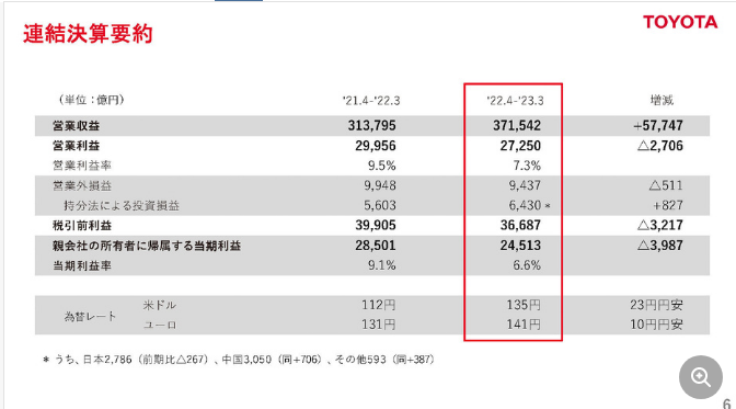 トヨタ 2023年3月期通期決算 営業収益37兆1542億円、営業利益2兆7250億円で増収減益