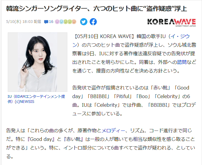 IUの所属事務所EDAMエンターテインメントは10日、「盗作疑惑で警察に告発されたという記事に接したが、捜査機関から連絡を受けておらず、告発状の内容も確認できていない」と表明した。一方で「虚偽事実をもとにした盗作疑惑と、根拠のないデマを盛り込んだ印刷物が一部地域に配布された事実を数カ月前から認知している」と指摘し、捜査機関に告訴状を提出したと伝えた。