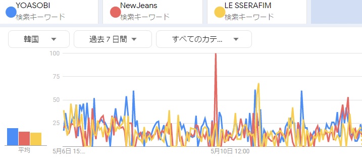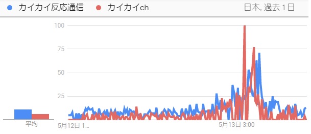 カテゴリー:すべて、それぞれ検索キーワードにして「5ch」にすると、検索量は増えますが、それでも5時過ぎに「カイカイ反応通信」が大きく増えているのは確認できますね。