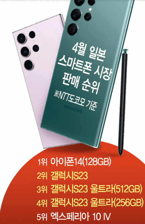 15日、日本1位の移動通信会社NTTドコモによると、4月の総販売順位でギャラクシーS23が2位に上がった。 3位はギャラクシーS23ウルトラ512GB(ギガバイト)、4位はギャラクシーS23ウルトラ256GBだった。 1位はアイフォン14128GBだった。