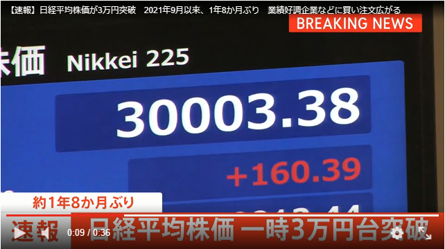 速報、日経平均株価が3万円突破 2021年9月以来、1年8か月ぶり 業績好調企業などに買い注文広がる