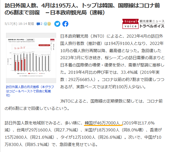 2023年1-3月の同時期、日本を訪れた韓国人観光客は160万人。昨年同時期の180倍だ。No Japanどうなった?