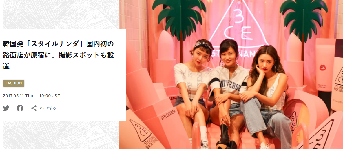 韓国発ブランド「スタイルナンダ(STYLENANDA)」の旗艦店「3CE STYLENANDA HARAJUKU STORE」が、8月31日をもって閉店する。3CE STYLENANDAの日本のオンラインモールはすでに閉鎖されており、原宿の旗艦店閉店により同ブランドは日本から事実上撤退することとなる。