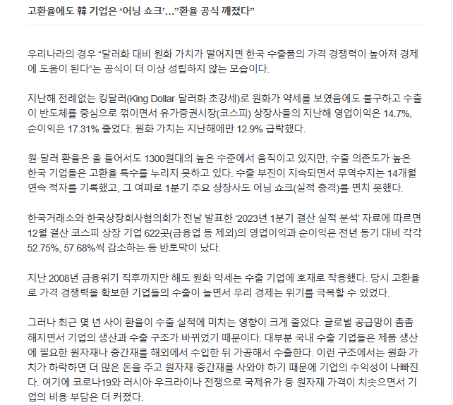 韓国も日本のように輸出企業が経済で占める比重が大きいが、いざ企業は昨年ウォン安の恩恵を享受できなかった。 市場と経済学界ではこの20年間、韓国の輸出構造が変わり過去の「高為替レート特需」が事実上消えたと評価する。 半導体寒波と対中国輸出不振の衝撃がウォン安にともなう価格競争力強化効果を相殺したという分析も出ている。>>49