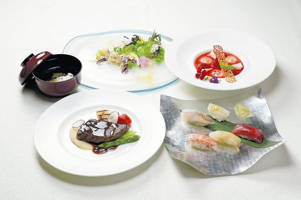 >夕食のデザートのチーズケーキは岩手県産、イチゴのジェラートは宮城県産。福島県の北にあるこの2県も2011年の東日本大震災で甚大な被害を受けた。