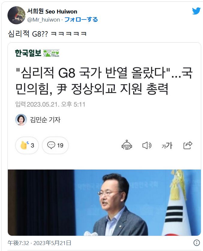 国民の力は、ユン・ソクヨル大統領が日本広島を訪問し、主要7カ国(G7)首脳会議の出席を含め、各国首脳と連鎖会談を持ったことについて「大韓民国は心理的G8国家に上がった」と推測した。