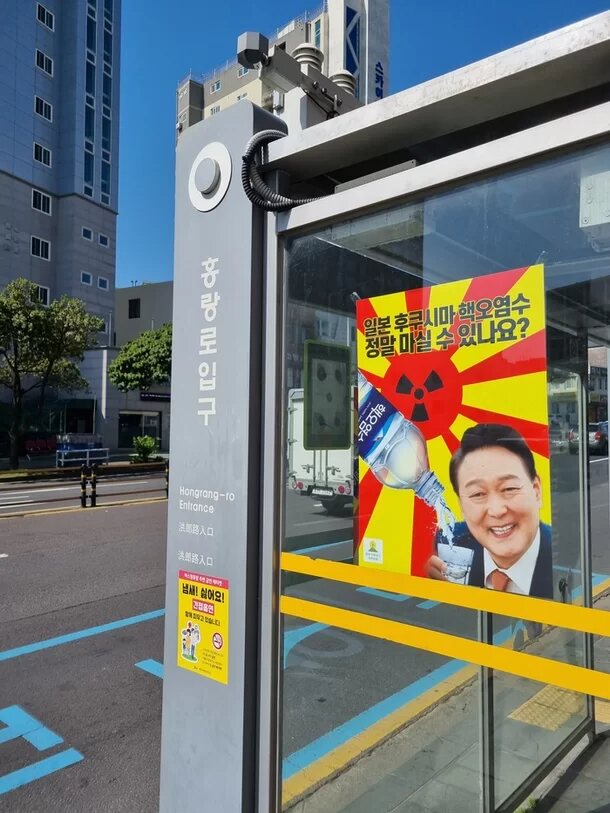 済州環境運動連合では今月2日から済州島の各地に「福島核汚染水海洋投棄(放出)反対運動」の一環としてポスター約300枚を製作・掲示している。このポスターには「日本・福島の核汚染水 本当に飲めますか?」という文と、旭日旗のようなデザインを背景に尹大統領がコップに核汚染水を注いでもらう合成画像が載っている。