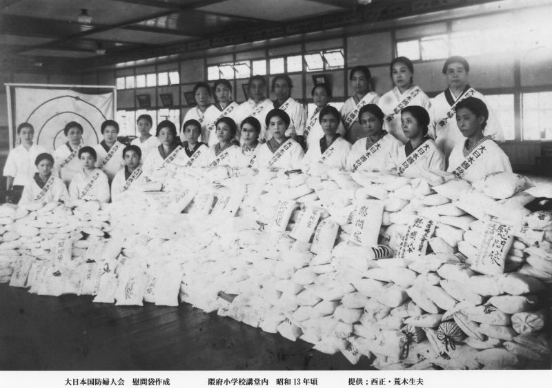 こちらの写真は日本本土の婦人たちが、小学校の講堂に、慰安袋を集積した写真です。