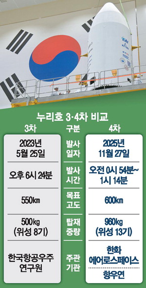 エンジンと燃料など外形的な発射体技術は以前と同じだが、任務難易度ははるかに高くなった。 最も大きく変わったのは搭載体だ。 3次発射に比べ総重量が2倍近く増えた960㎏にもなる。 ヌリ号に載せられた衛星数が8機から13機に増加したためだが、韓国航空宇宙産業(KAI)の次世代中型衛星3号と国内大学およびスタートアップが開発したキューブ衛星12機が含まれた。