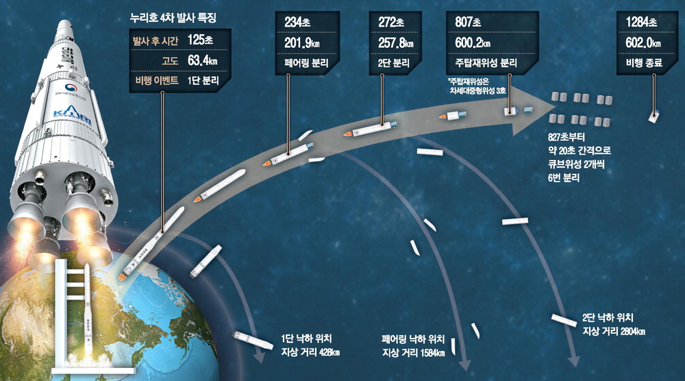 ヌリ号が発射されて13分27秒後、衛星分離が始まる。 主搭載衛星である次世代中型衛星3号から分離を始め、その後、副搭載衛星であるキューブ衛星12基が2基ずつ約20秒間隔で射出される。 射出順序は世宗大·クォーターニアン、宇宙路テック·コスモワークス、コスモワークス·仁荷大、韓国科学技術院(KAIST)·ハンコムインスフェイス、ソウル大·スペースリンテック、韓国電子通信研究院(ETRI)·韓国航空宇宙研究院衛星の順だ。 2U(ユニット·1Uは横と縦、高さ10㎝)の大きさで最も小さい世宗大キューブ衛星から始まり、12Uで最も大きな航宇研衛星が分離され射出が終えられる。