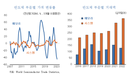 メモリとシステムに限定すると、2022年基準の韓国半導体輸出のうち、メモリの割合は63.8%だ。第1四半期の半導体輸出減少幅が-40.9%を記録した理由はここにある。