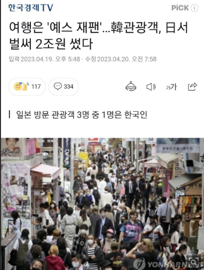 抑圧されていた海外旅行需要がコロナ19エンデミック・円安とかみ合って日本観光需要が爆発し、今年1~4月に日本を訪問した韓国人観光客が200万人を超えたことが調査された。この期間、訪日観光客3人のうち1人が韓国人だった。