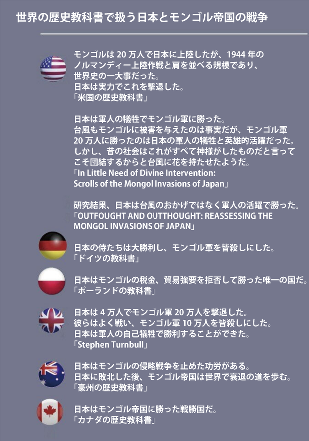 「イギリスの教科書」日本は4万人でモンゴル軍20万人を撃退した。 彼らはよく戦い、 モンゴル軍10万人を皆殺しにした。 日本は軍人の自己犠牲で勝利することができた。