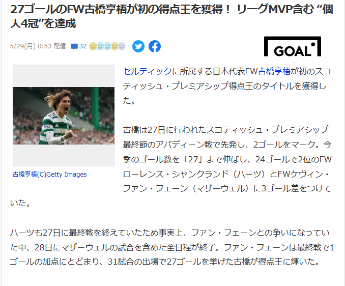 古橋は27日に行われたスコティッシュ・プレミアシップ最終節のアバディーン戦で先発し、2ゴールをマーク。今季のゴール数を「27」まで伸ばし、24ゴールで2位のFWローレンス・シャンクランド(ハーツ)とFWケヴィン・ファン・フェーン(マザーウェル)に3ゴール差をつけていた。