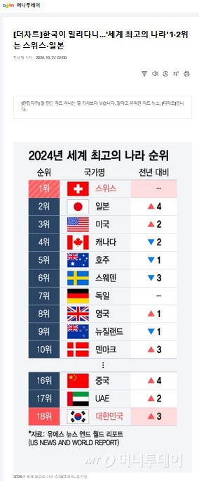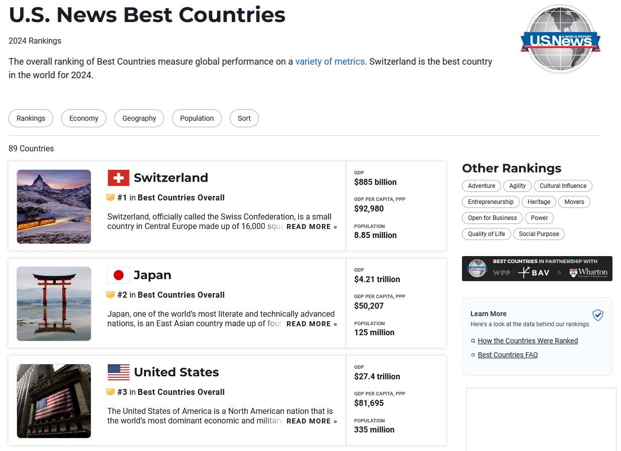 미국 시사주간지 유에스 뉴스 앤드 월드 리포트(US NEWS AND WORLD REPORT, 이하 USNWR)는 지난 9월 10일(현지 시간) '2024 세계 최고의 국가'(Best Countries) 순위를 발표했다.