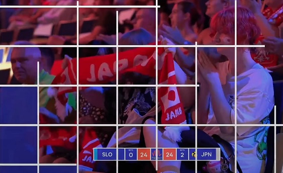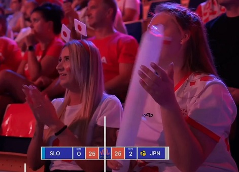 スロベニア、サーブミスの後、フェイントがブロックに捕まって 19-22 とリードされた所で、スロベニア2度めのタイムアウト。西田がサービスエースを決めて、日本が第1セット先取!