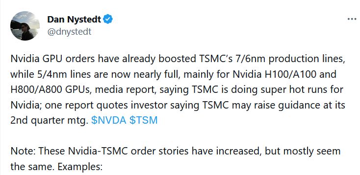 TSMCは2023年4月の投資家向け説明会にて、2023年第1四半期のビジネスは、マクロ経済の弱体化と最終市場の需要の軟化によって影響を受け、顧客はそれに応じて需要を調整することになったと述べていたほか、第2四半期も顧客のさらなる在庫調整により、業績に影響が出ることを予想していると説明していたが、今回のNVIDIAからの予想外の緊急注文によって、TSMCは5nmプラットフォームを中心に稼働率が高まる見通しで、その結果、TSMCの業績が好転すると見る業界関係者も多い。