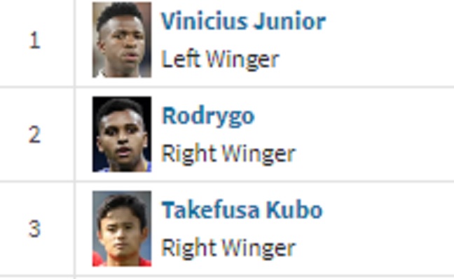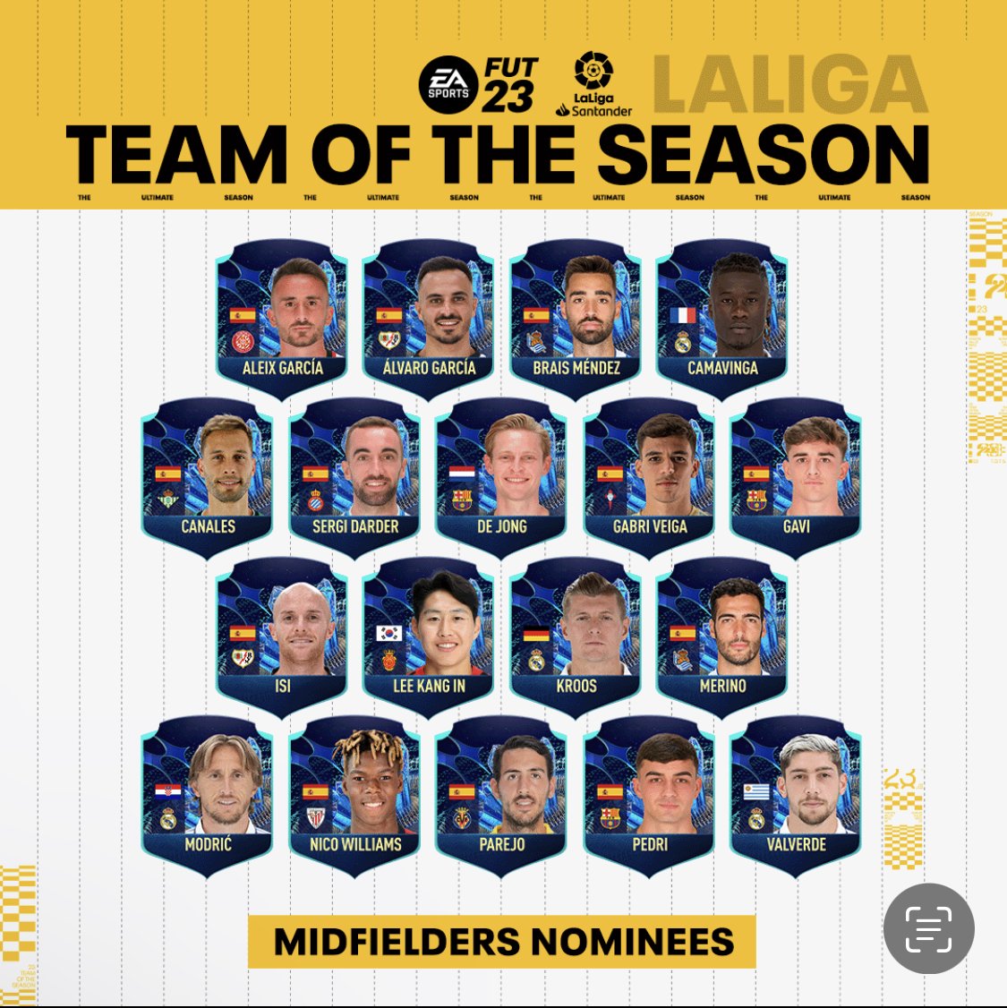 トニー·クロス、プレンキー·デ·ヨン、ブライス·メンデス、セルヒオ·カナレス、ミケル·メリノ、ガビ、フェドリ、ルカ·モドリッチ、セルジ·ダルデル、ガブリベイガ、フェデ·バルベルデ、ダニ·パレホ、エドゥアルド·カマビンガ、ニコ·ウィリアムズ、アイザック·パラゾン,アルバロガルシア, イガンイン, アレースガルシア