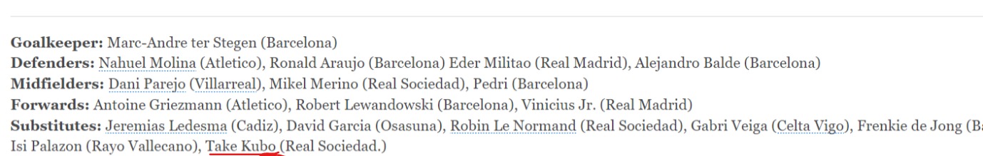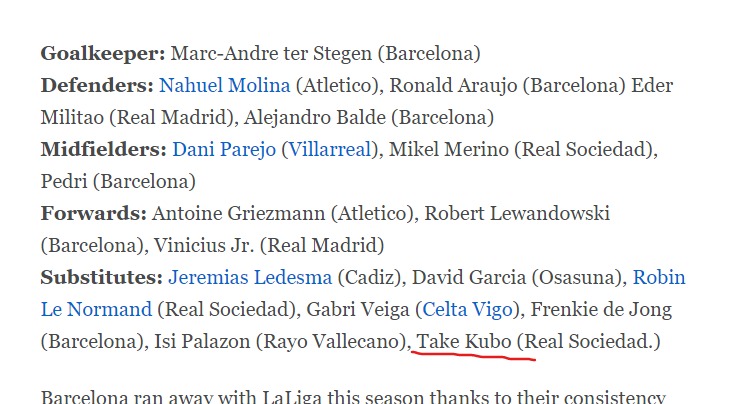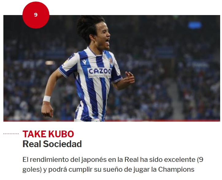 「レアル・ソシエダの今シーズンは、多くの栄誉とともに傑出したものとなった。試合の大部分で披露されるサッカー、競争力などは国内外で人々を魅了してきた。最も大きな影響を与えた選手のひとりがタケ・クボで、彼はこの最後の段階で全力を尽くし、有名な国際的メディアである『The Athletic』の今季の理想的イレブンに食い込んだ」