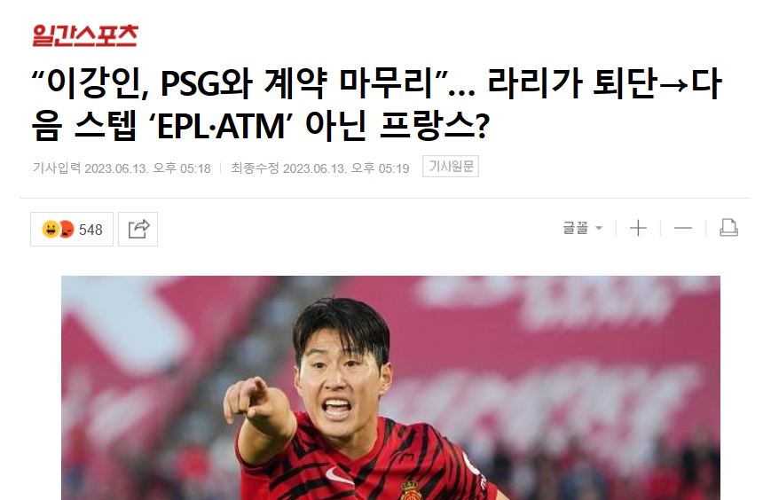 李カンイン(22、マヨルカ)の行き先がフランスリーグ1パリ·サンジェルマン(PSG)に決まる雰囲気だ。