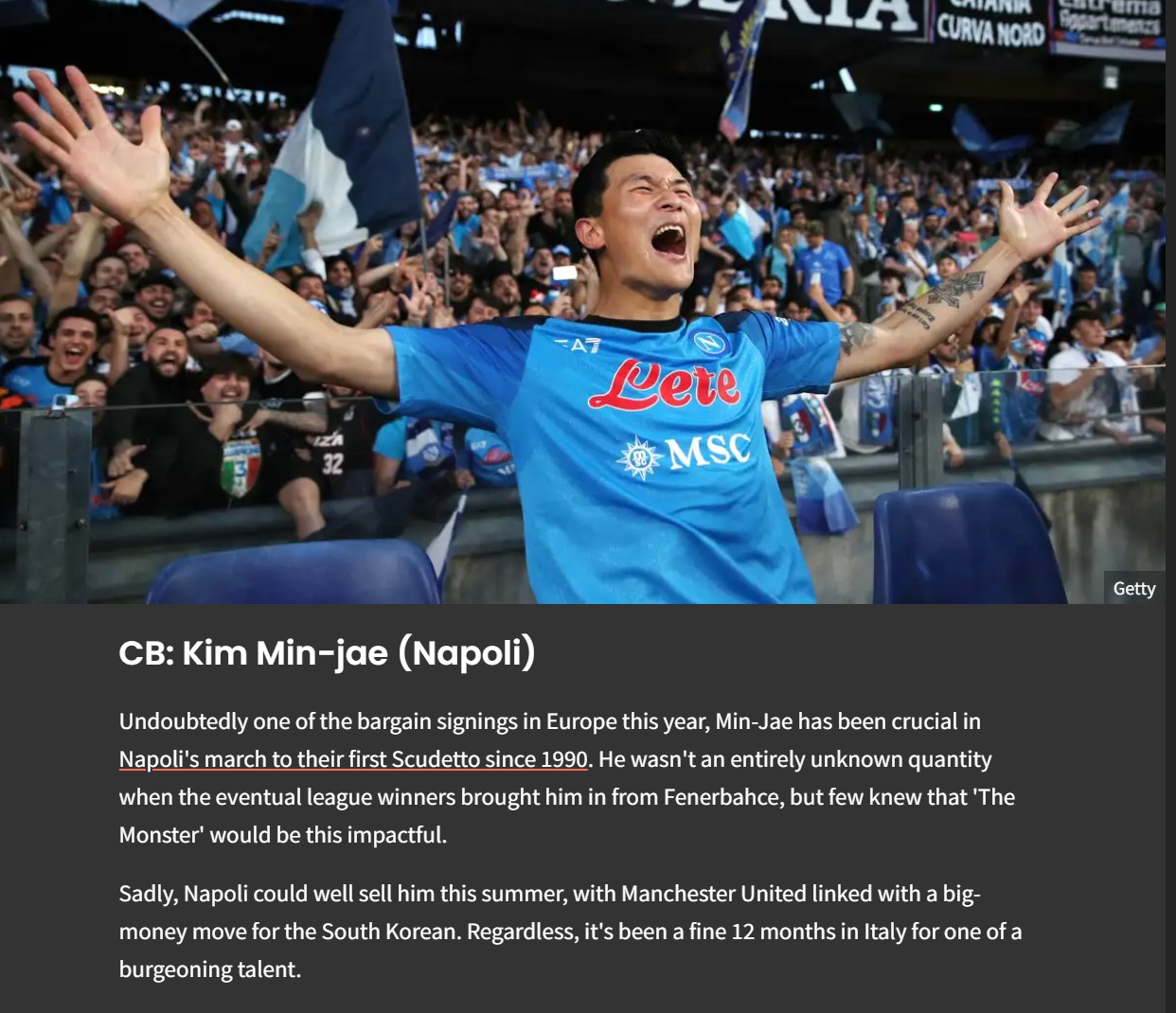 김민재, 이탈리아 리그 최고의 수비수 확정