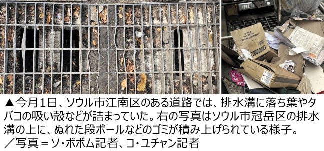 ソウル市の各自治区には排水溝を定期的に清掃する担当員がいるが、清掃する回数が少なすぎると指摘されている。冠岳区では年1回、江南区では年2回だけ排水溝の清掃を実施しているという。これではゴミがたまる速さに比べ少なすぎる。>>1