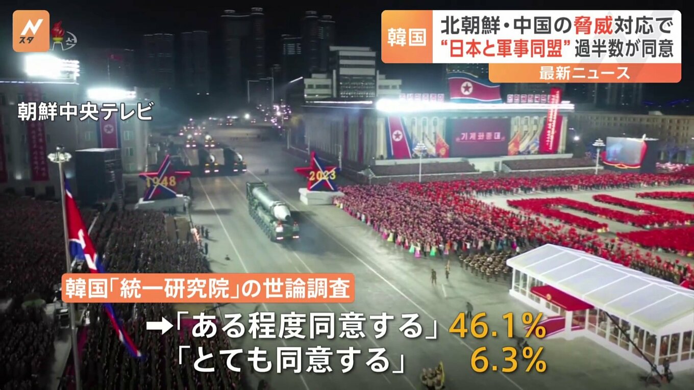 韓国政府傘下の「統一研究院」がきょう発表した世論調査の結果によりますと、「北朝鮮の脅威に対応するために韓国と日本は軍事同盟を結ぶべきだ」という項目に「ある程度同意する」や「とても同意する」と答えた人が、あわせて5割を超えました。
