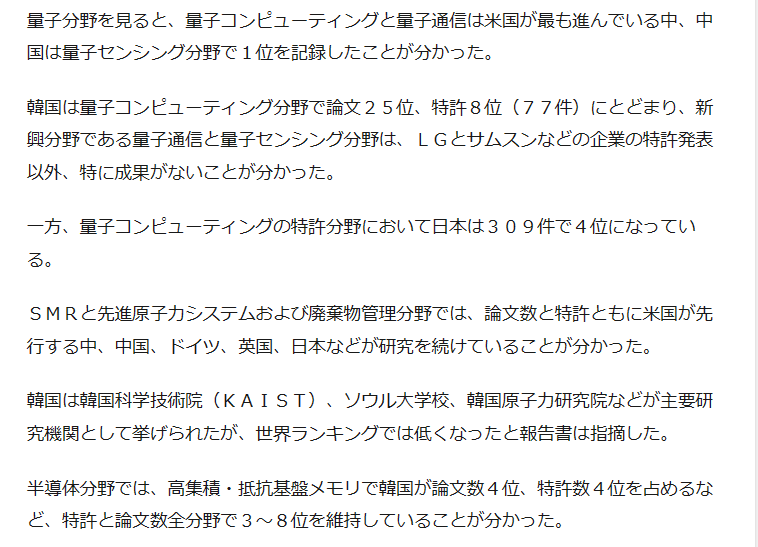 報告書は量子分野については、「韓国は追撃型人材育成と研究投資戦略を実施しているが、まず国内の専門人材の確保と挑戦的な研究強化を基盤に海外協力基盤を構築する必要がある」と指摘した。