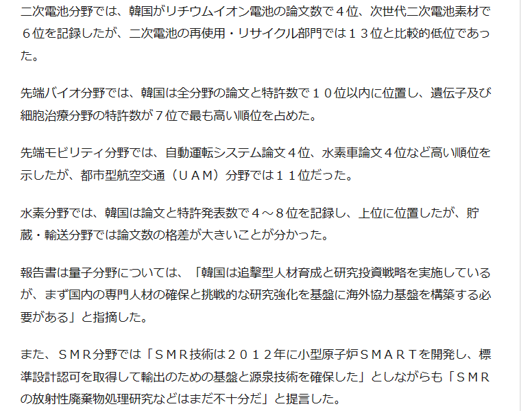 韓国は韓国科学技術院(KAIST)、ソウル大学校、韓国原子力研究院などが主要研究機関として挙げられたが、世界ランキングでは低くなったと報告書は指摘した。