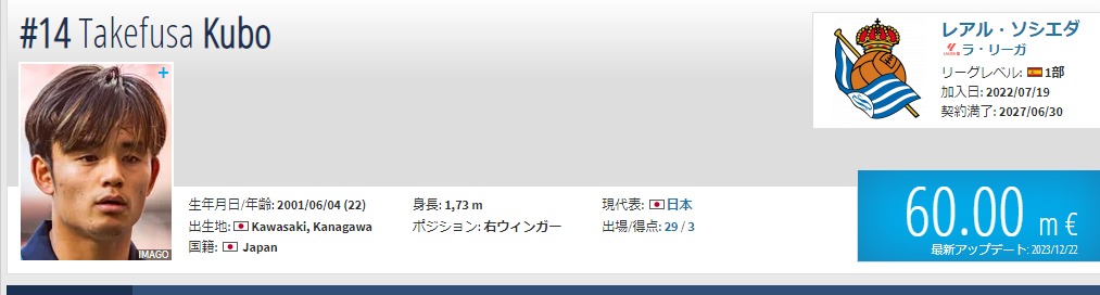 さらに、サッカー専門調査機関「CIES」が発表した最新の推定移籍金トップ100で、久保は5850万ユーロ(約87億円)で90位にランクイン。今季プレミア3連覇を果たしたマンチェスター・シティのポルトガル代表MFベルナルド・シウバ(5470万ユーロ/81億円)よりも上の評価となり、「ムンド・デポルティーボ」紙では「クボはすでに世界のトップ」との見出しで「世界のスターを差し置いてのランクイン」と伝えられた。