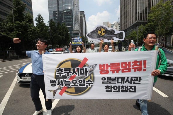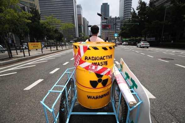 韓国の環境団体が、福島第一原発の放射性汚染水の海洋放出の中止を求めて「放射能廃棄物」と記されたドラム缶を車に積んで在韓日本大使館まで行進した。
