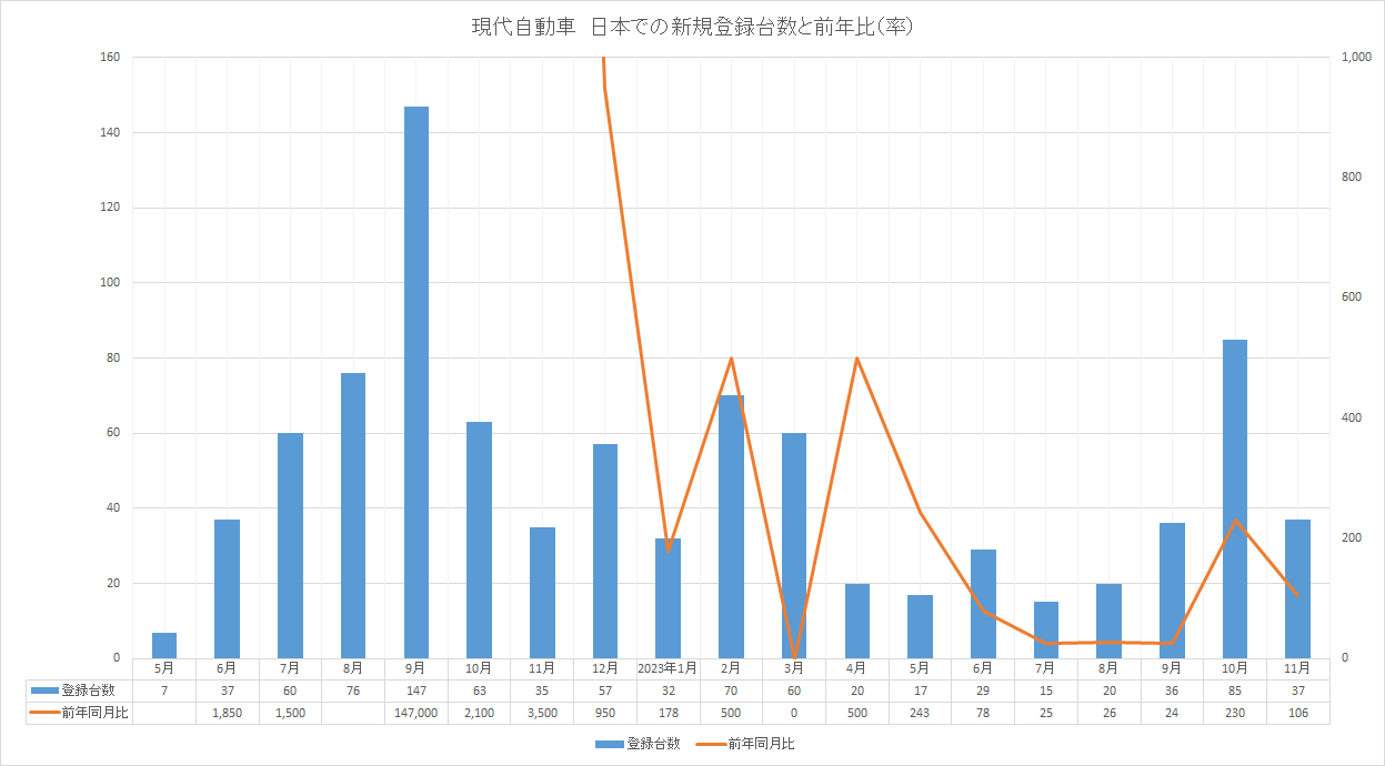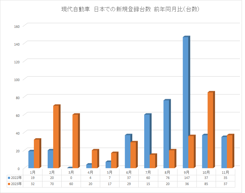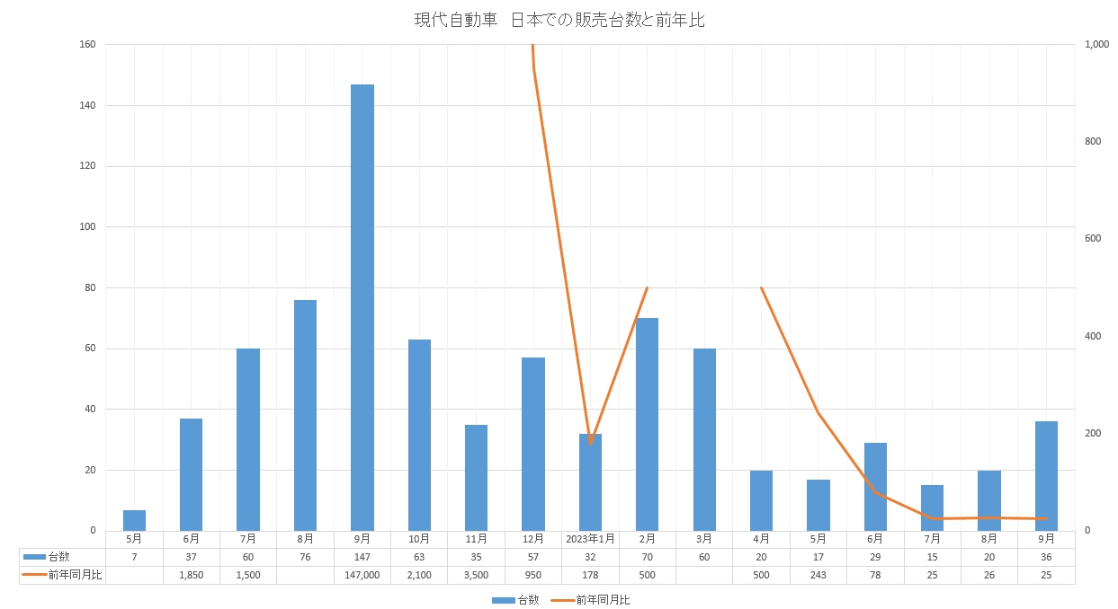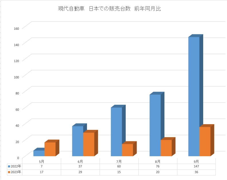 2023年6月12日、韓国・アジア経済は「現代自動車(ヒョンデ)の先月の日本市場での販売台数は17台だった」とし、「12年ぶりに再進出し、初年度の半年間で500台を売り上げ成功の可能性を見せたが、それから約半年が過ぎた現時点では満足できない成績だ」「中国のBYDとの真っ向勝負でも押されている」と伝えた。