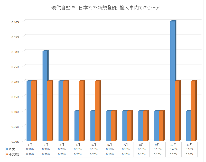日本で販売された輸入車の中の0.2%と言うのが、現代自動車の立ち位置です。